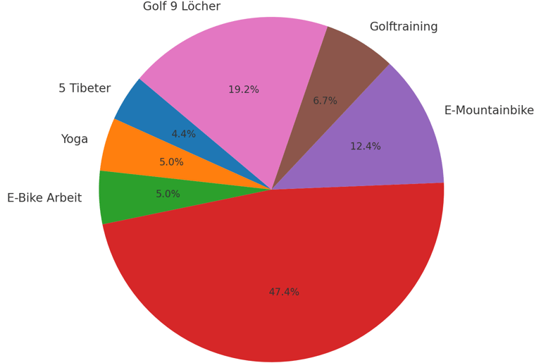 Ausgehend von meinem Gewicht und den üblichen MET-Werten der Aktivitäten, verbrenne ich ca. 5.570–6.200 kcal pro Woche allein durch Sport und Bewegung – zusätzlich zum Grundumsatz.